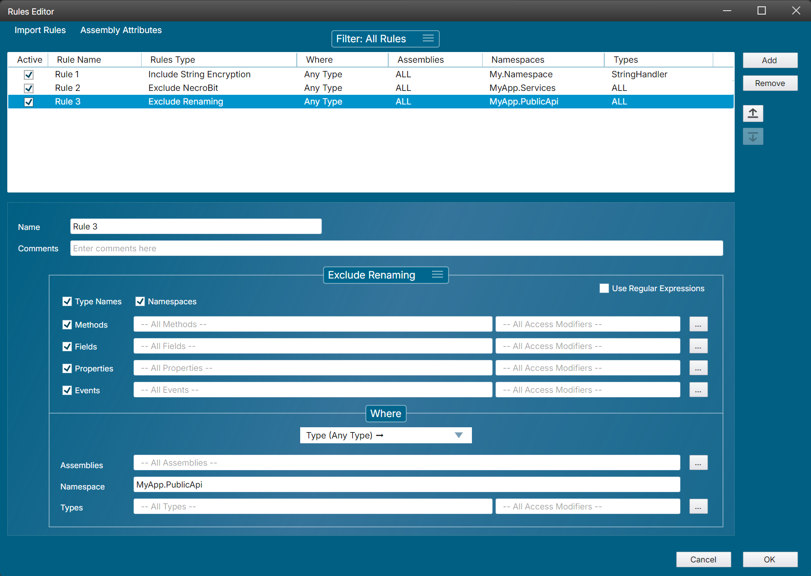 - A Rules Type area (e.g., “Exclude Renaming” in the screenshot) indicates which obfuscation features are being turned on/off. You can toggle checkboxes (e.g., Type Names, Namespaces, Methods, Fields, Properties, etc.) or specify method/property names to include or exclude from renaming or from other features.