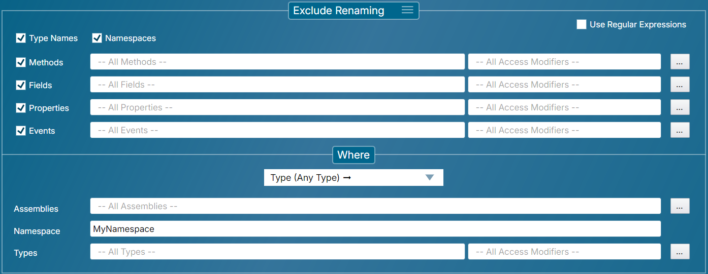 All internal classes containing “Special” in their names, located in namespaces starting with “My” are excluded from renaming.