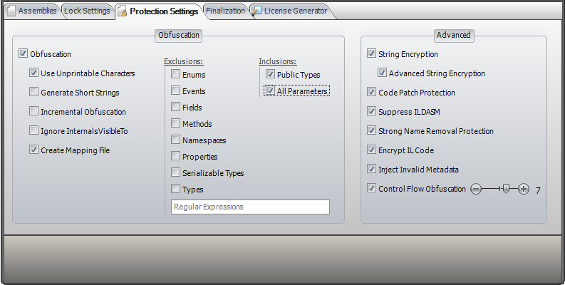 Exclusions - If you want to prevent specific kind of types or members from obfuscation, you can enable the corresponding option here. Please note, IntelliLock offer declarative obfuscation as well.