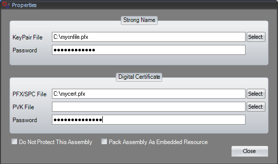 Here you can specify your strong name key pair file as well as the digitial certificate with the corresponding password. Furthermore you can choose to pack the assembly as embedded resource. If you check "Do Not Protect This Assembly" IntelliLock does not apply any lock or protection features to this assembly. Of course it is still possible to merge this assembly with the main assembly.