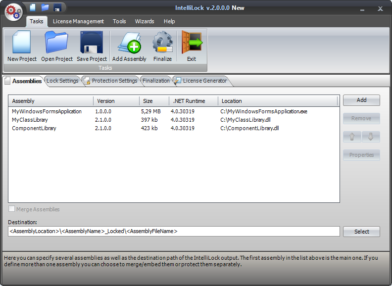 The IntelliLock UI is comprised of a menu/bar system and the Main Panel. The menu system provides access to all functions and tools. The Main Panel provides access to the categorical features of your IntelliLock project. Each of these features is explained by the topics which follow.